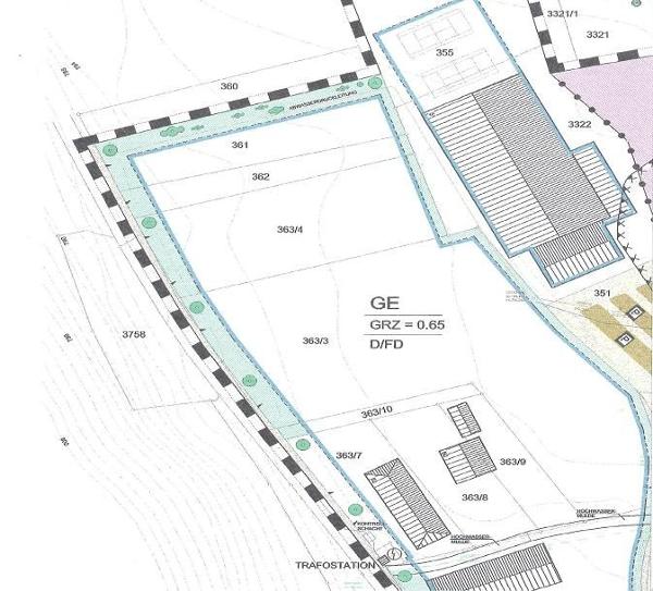 | Beschreibung / besondere Merkmale | Gebäudehöhe: 7-10 m Im Gewerbegebiet können vorwiegend nicht erheblich belästigende Gewerbebetriebe angesiedelt werden. Dazu zählen Gewerbebetriebe aller Art, Lagerhäuser, Lagerplätze, öffentliche Betriebe, Geschäfts-, Büro- u. Verwaltungsgebäude, Tankstellen und Anlagen für sportliche Zwecke. Ausgeschlossen sind lt. Bebebauungsplan: - Einzelhandelsbetriebe, Verbrauchermärkte ab 200 m²: - Vergnügungsgaststätten: - Beherbergungsbetriebe : Alle freien Flächen befinden sich derzeit in Privatbesitz |