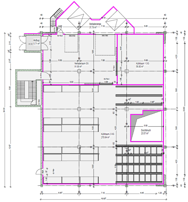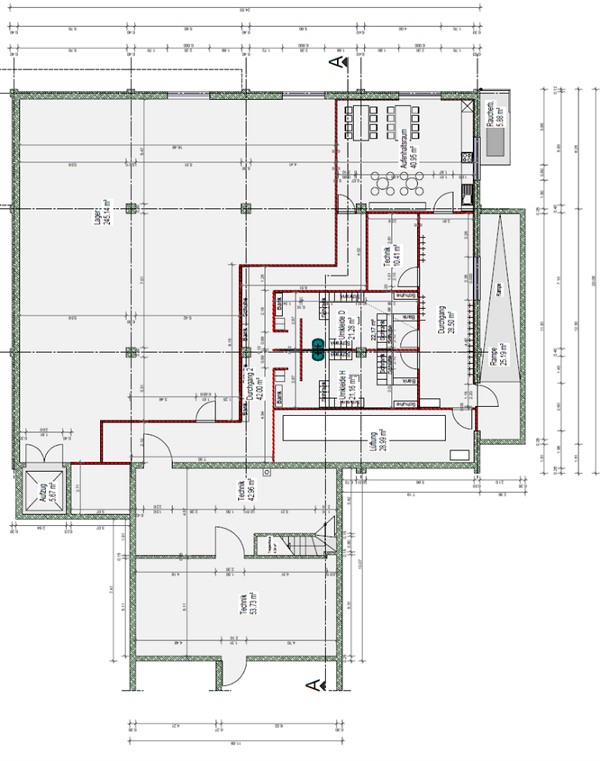 | Beschreibung / besondere Merkmale | Das Gebäude ist in drei Ebenen aufgeteilt. Im Untergeschoß, gleichzeitig der Zugangsbereich, befinden sich die Sozial- und Aufenthaltsräume für bis zu 50 Mitarbeiter. Sehr gut auch geeignet als Schleuse für den Zugang zu z. B. hygienebezogener Fertigung. Das Erdgeschoß eignet sich bestens für Fertigung/ Produktion jeder Art auch befindet sich eine Rampe im Erdgeschoss, wodurch eine schnelle und unkomplizierte Verladung möglich ist. Die Stützabstände betragen ca. 5,5 m, insofern sind die Räume flexibel gestaltbar. Über einen Lastenaufzug gelangt man in den Lager- und Kommissionierungsbereich auf Straßenniveau, sowie zu den zwei Rampen auf der Nordseite des Gebäudes. Die Rampen können für große LKW´s gut genutzt werden. |