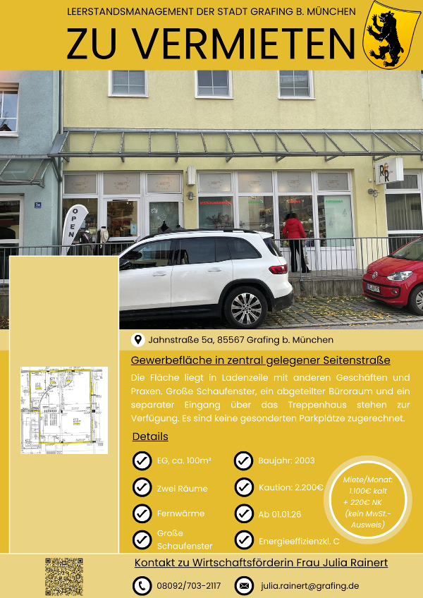 | Beschreibung / besondere Merkmale | Die Fläche befindet sich in einer Ladenzeile mit verschiedenen anderen Geschäften und diversen Praxen. Große Schaufensterflächen, ein abgeteilter Büroraum und ein separater Eingang über das Treppenhaus stehen zur Verfügung. Der Fläche sind keine gesonderten Parkplätze zugerechnet. |